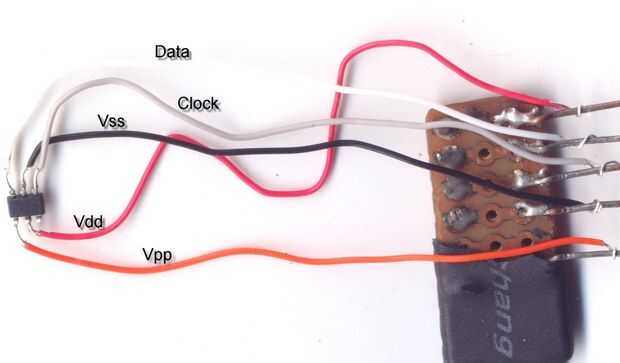Los alambres están en una especie de código de color. El negro es tierra o cero ferrocarril voltios, que Microchip llama VSS. roja es positiva + 5 volts, o el carril de la fuente, que Microchip llama Vdd. Orange es el voltaje de programación, y el blanco y el gris llevan los datos y reloj para programación respectivamente.