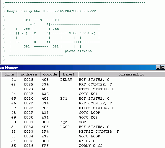 Un fragmento del código también se muestra. El programa toma 56 ubicaciones en memoria. El PIC10F200 tiene 256 esos lugares disponibles. Una melodía que consta de 200 notas más o menos puedan montarse este chip.