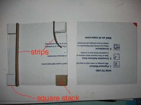 3. cortar 2 tiras de cartulina, la longitud de la gran plaza x la altura de las pilas de cartón. Hice tiras de 6 "x 1/2". Pegue una tira a los lados de las dos pilas en el lado izquierdo. Ahora toma el segundo tira y enrollar en espiral (Nota: si uso corrugado cartón etc van con el grano al rodar. Usted puede anotar con una cuchilla si no ondulado pero no cortar demasiado profundo.) Ahora pegue un extremo de la faja enrollada a la pila derecha superior. Doblar hacia la derecha. No corte