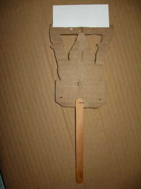 5. con su pop-up terminado Coloque un palito (u otros materiales robustos.) a la mitad de la base de su pop-up con un alfiler. Puede utilizar un cuchillo x-acto o pedacito de taladro pequeño hacer un pequeño agujero a través de la base de la ventana emergente y el palito para poner el pin, pero no más grande que la cabeza del perno.