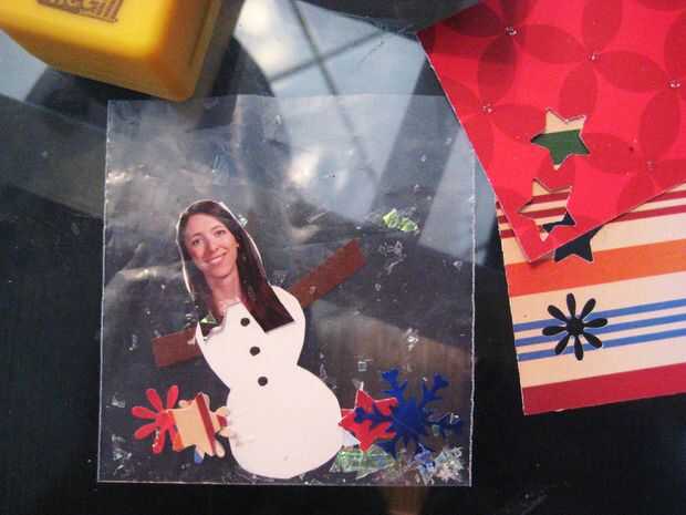 Poner su muñeco de nieve en la envoltura de celofán y agregar brillo y otras cosas como tinsle. También he añadido pequeño agujero perforado círculos y estrellas hechas de papeles bonitos.