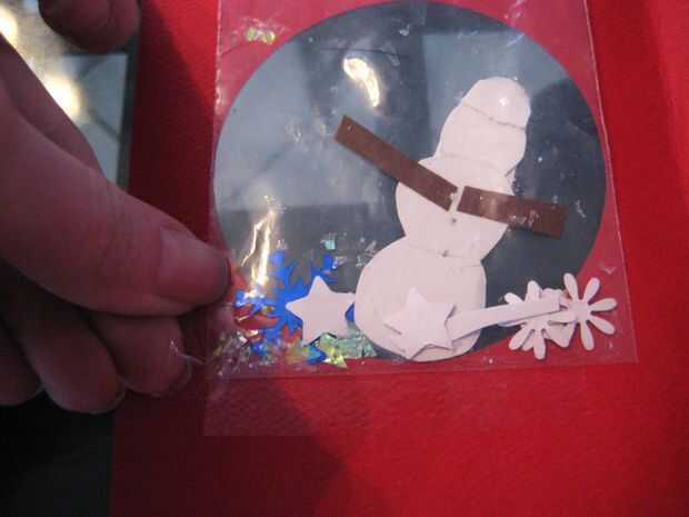 Abrir la tarjeta y colocar el snowglobe en el interior con la abertura hacia arriba. Usando cinta snowglobe en el interior de la tarjeta. Asegúrese de que usted completamente con cinta adhesiva la abertura de la envoltura de celofán para no sale brillo.
