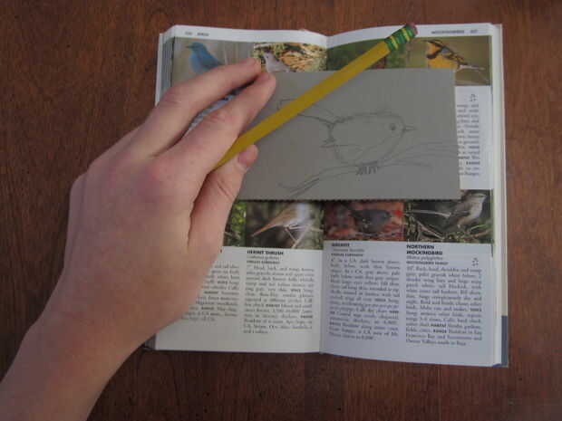 Haz tu dibujo en el linóleo. Dibujé un pequeño pájaro llamado "Wrentit". Después de dibujar, decidir qué 3 colores que desee en el cuadro. Blanco no cuenta. Elegí el amarillo, rojo y negro. En este momento usted debe también estar pensando en lo que va a ser de color, porque cada vez que haga una nueva capa de impresión, se tallan más el linóleo.