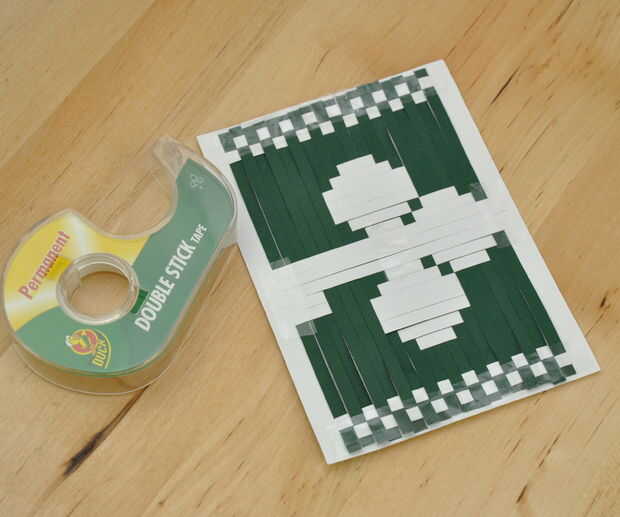 Tiempo a pegar hacia abajo.  Decidí usar cinta de doble cara, ya que podía cubrir más área más fácil.  Así que me puse las tiras de cinta el borde tratando de cubrir el blanco de la tarjeta y las tiras verdes.  Si solo cubres el verde y no la tarjeta blanca, no se adhieren bien.