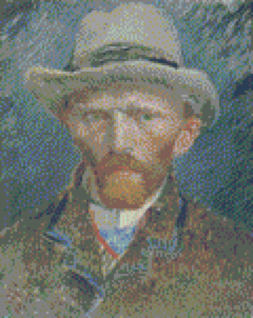 Las imágenes originales de las pinturas eran pixelado en Photoshop para darles un vistazo de gráficos de computadora retro. Hay probablemente muchas maneras para pixelar una imagen, pero aquí está uno. En primer lugar, guardar una nueva versión de la imagen en formato GIF con los colores de Windows sólo aptos para el web ("guardar para Web...", se pueden seleccionar colores compatibles con web en el icono pequeño al lado de la tabla de colores). Entonces, redimensionar la imagen a tamaño muy pequeño, como anchura px 100 ("Imagen" > "Tamaño de imagen"). A continuación, abra la nueva pequeña imagen GIF en Photoshop y cambiar otra vez a cerca de diez veces más grande. Esto crea la apariencia pixelada. Aquí puedes ver algunos ejemplos de las imágenes de Rijksmuseum, lechera de Johannes Vermeer (ca. 1660) y el autorretrato de Vincent van Gogh (1887). Usted puede encontrar a continuación todas las imágenes creadas en el taller. Si usted los usa, sería bueno si atribuir el Rijksmuseum como proveedor original a pesar de que las imágenes son de dominio público.