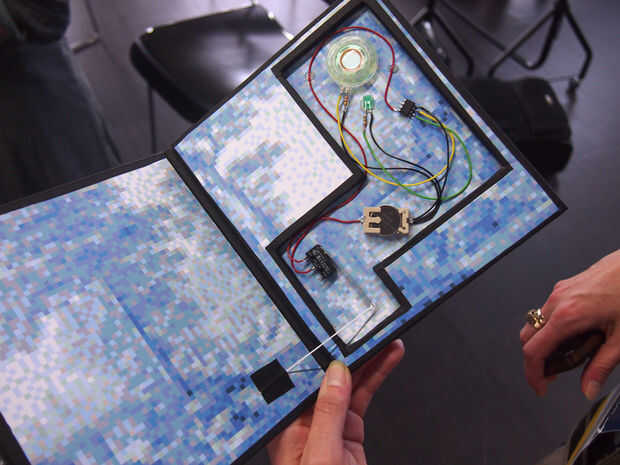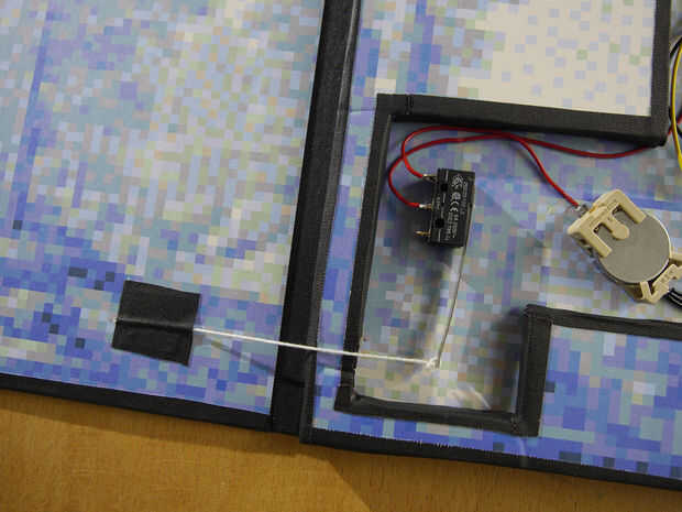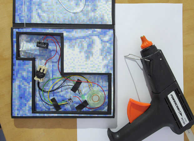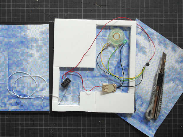El compartimiento de la electrónica dentro de la tarjeta fue hecho de tablero de la espuma gruesa de 5 milímetros. Esta altura garantiza que las partes más altas de la electrónica aún podrían caber para que la tarjeta podría ser cerrada completamente. En primer lugar, se cortó un pedazo de tablero de la espuma que empareja el tamaño de la página de la mano derecha dentro de la tarjeta. Un gran agujero se corta en obra para la colocación de la electrónica. El orificio fue cortado que había espacio para colocar el interruptor cerca de la parte inferior izquierda de la página (cerca de la tapa de la tarjeta). Esto permitió hacer fácilmente el mecanismo de la conmutación que tocaba la melodía cuando se abre la tarjeta. El compartimiento de la electrónica también fue decorado con impresiones de pixel y cinta de tela y atado con cinta de doble cara de la tarjeta.