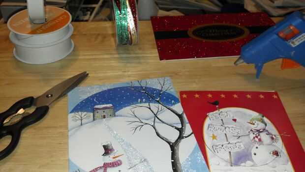 Lo que a los titulares de la necesidad de vaciar la cinta, un trozo de cinta como la suspensión, tarjetas de Navidad viejas, fotos familiares, una obra de arte de niños o lo quieres utilizar a lo largo de esta línea, pegamento y brillo (opcional).