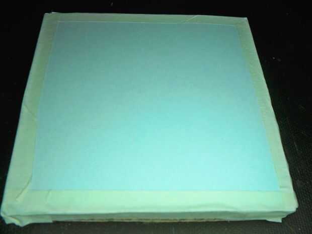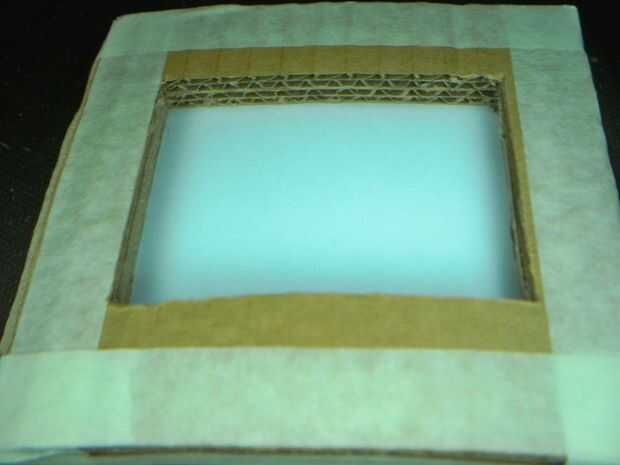 Ahora no queremos la placa de circuito a caer, así que cortarse una pieza cuadrada de 12cm de cartulina fina y cinta adhesiva en la parte trasera de su vivienda de la placa de circuito.