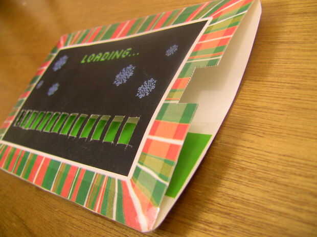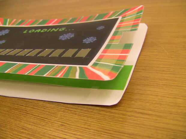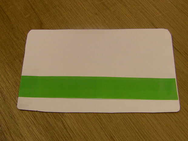 Para combinar las dos piezas (el uno que dice "carga") y con la barra verde, necesita primero colocarlos directamente encima de la otra (la "carga" uno debe estar en la parte superior). A continuación, se puso una hebra de un borde de cinta uno de la tarjeta dejando la mitad para colgar, luego doblar la mitad que cuelga a la parte posterior de la tarjeta. Básicamente lo que está haciendo es pegándolas juntas desde el exterior. Hacer esto a todos los bordes excepto el borde derecho.