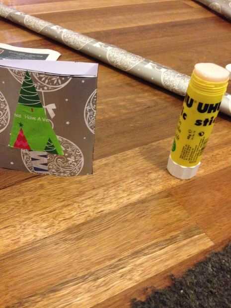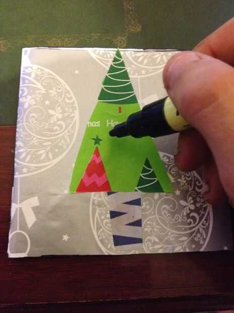 Ahora, pega el verde envoltura triángulo de papel en la parte frontal de la tarjeta. Ser centrado, con la punta superior toque la parte superior de la tarjeta. Ahora, recorta un pequeño cuadrado del diario. Pegue esto en bajo el triángulo, y ahora tienes un árbol de Navidad!!!!!! Pero no por mucho tiempo, que ahora salga el marcador permanente y logo Illuminati Inc. en el triángulo de la transferencia. Ahora tienes un árbol de Illummas.