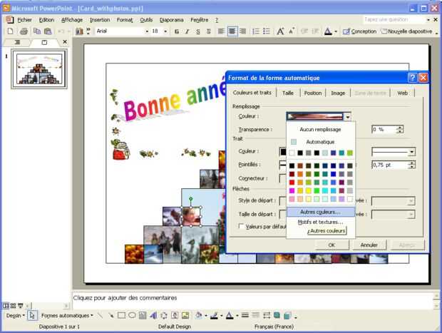 Se puede ver en el pantallazo adjunto lo que aparece en mi Powerpoint: lo siento es una versión en francés y es bastante antigua, pero usted debe encontrar su camino como grandes ¿EH?