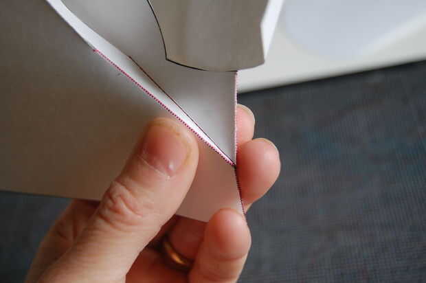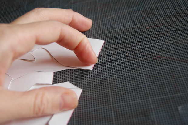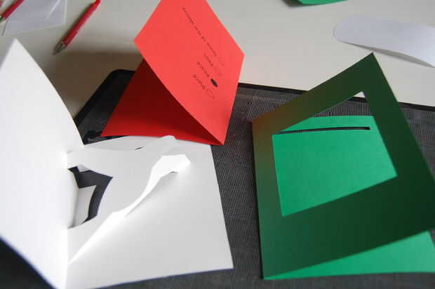 Gire la tarjeta blanca para no ver las líneas impresas y deslice su mano derecha detrás de la paloma. Su mano izquierda será en el frente con los dedos en el fondo al lado de donde la cola se encuentra con pliegue central de la tarjeta (estaba tomando la foto con mi mano izquierda...). Empujar la cola hacia fuera con su dedo índice derecho. Una vez que la cola es gruesa hacia fuera, el resto es fácil. Saltar suavemente las alas, voltee la tarjeta y apriete la cola y entonces usted puede doblar la paloma completamente plana.
