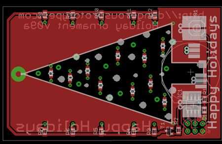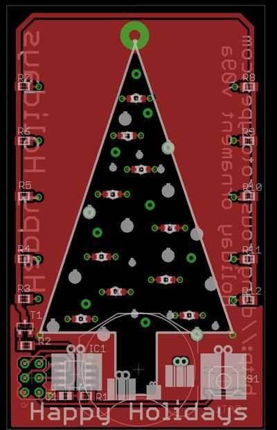 Utilizamos vias, los componentes y la pantalla de seda para crear un tema de Navidad. Este es nuestro primer intento, tal vez se a convertido en una tradición navideña que mejoramos año tras año. La placa final debe tener vias plata visible en el árbol, no los hacemos bastante grande en el prototipo. También quitamos el año, así que si no entregan a tiempo para Navidad puede utilizarse más tarde.