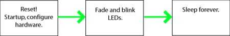 Cuando el programa finaliza, el chip sólo va a dormir para siempre. Esto es diferente que muchos programas de microcontrolador que reanudar desde el sueño en un perno cambian interrupción. Una prensa del botón restablece el ATtiny y empieza el programa otra vez.