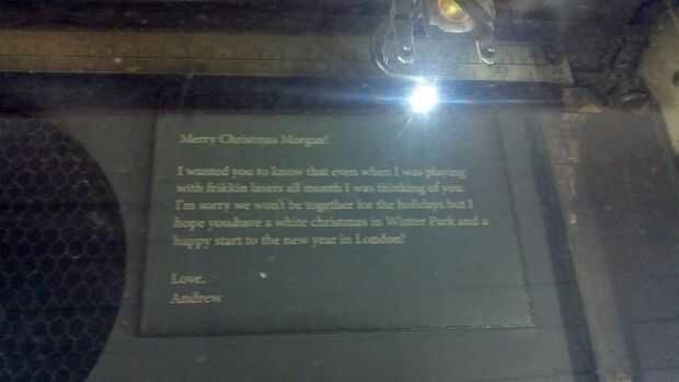 Cuando esté satisfecho con su diseño, ejecutar una serie de pruebas de potencia en el MDF para determinar la configuración correcta. El archivo de prueba de energía adjunto podría ayudar. Usé 60/30 de velocidad/encendido para raster y 10/90 para el corte de vector con 2 pases de vector. Finalmente, utilice estos ajustes para grabar y cortar tu tarjeta de Navidad!