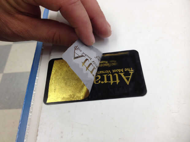 Después de permita que se enfríe durante un minuto. Cuidadosamente despegue la cinta trasera y con una cáscara hasta quitar el papel. Es posible que cierto exceso en la tarjeta. Sólo ligeramente chatarra apagado con una cuchilla de afeitar.
