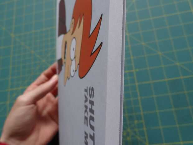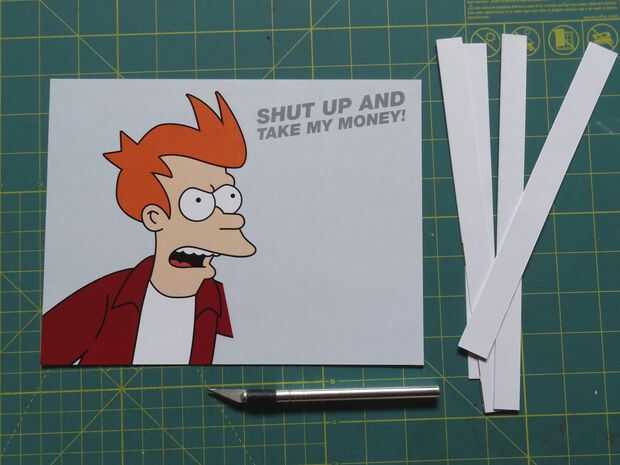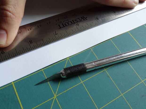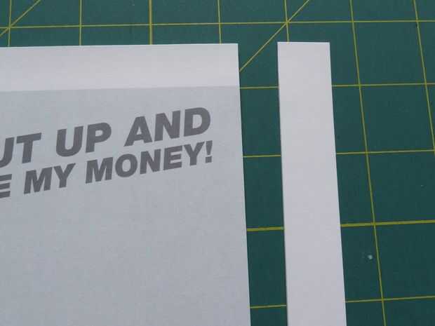 Una vez que tengas las dos piezas juntas, busto el X-acto cuchillo y regla y recorte los restantes internos blanco alrededor del exterior de la tarjeta. Si usted está preocupado acerca de la tarjeta no está correctamente alineada después grabarlo, hay un margen bastante decente de error donde puede cortar en la impresión color, y no ser demasiado sensible.