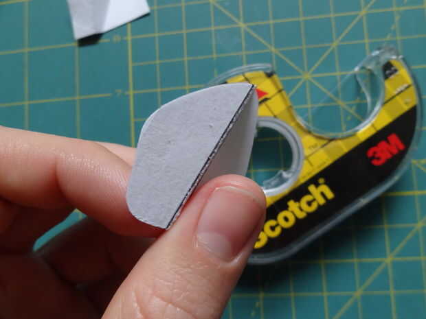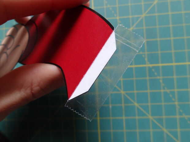El cuadro popout necesita un pedazo de cinta adhesiva que cubre la parte inferior de la tapa de la derecha y la parte superior de la tapa de la izquierda. Se orienta la misma manera en la tarjeta como el paso anterior. Fije la caja popout a la tarjeta (no adjuntarlo al brazo todavía).
