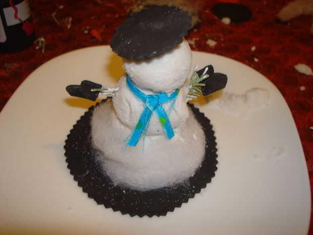 Coloque la bufanda sobre los hombros del muñeco de nieve. Colóquelo donde desee. Con cuidado coloque el cabezal sobre el cuerpo del muñeco de nieve. Llene grietas si es necesario. Pintar sus ojos, nariz y boca, con la pintura de tubo negro. Colóquese su sombrero cuidadosamente.