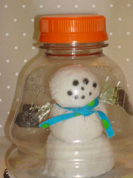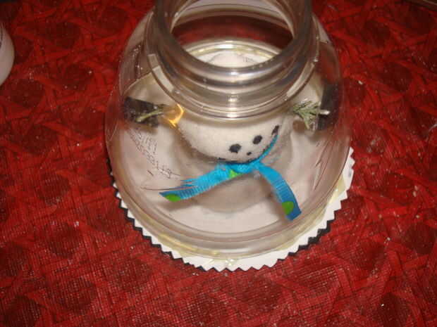 • Con cuidado coloque la botella sobre el muñeco de nieve.   Asegúrese de que encontrar el lado claro de la botella antes de pegarlas a la base.