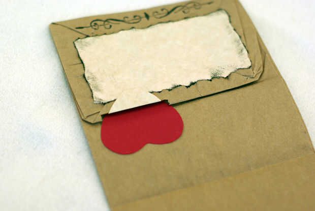 Aplique pegamento en la parte trasera inferior 0.5" o pulgadas tan del corazón. Coloque esto apenas cubre la aleta del bolsillo en la parte superior.