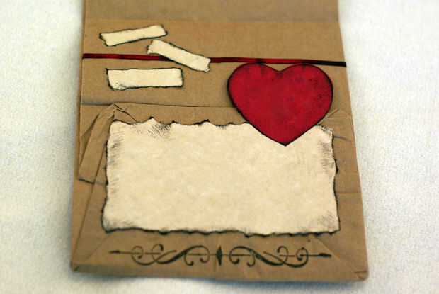 Aplique pegamento en la parte posterior de cada pieza de papel. Colocarlos de manera desordenada a lo largo de la izquierda de la mitad de la parte interior de la tarjeta.