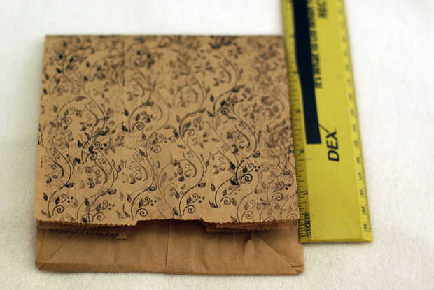 Oriente la bolsa de modo que el lado decorado hacia abajo, dejando el lado en blanco hacia usted. El fondo de la bolsa debe ser más cercano a usted. Doblar la parte superior de la bolsa hacia abajo de 5 pulgadas. Esto deja aproximadamente 0,75" del interior de la tarjeta visible. Pliegue del pliegue bien.
