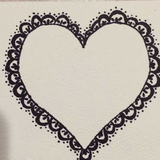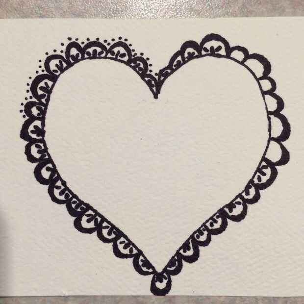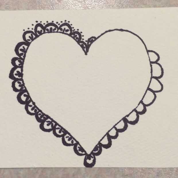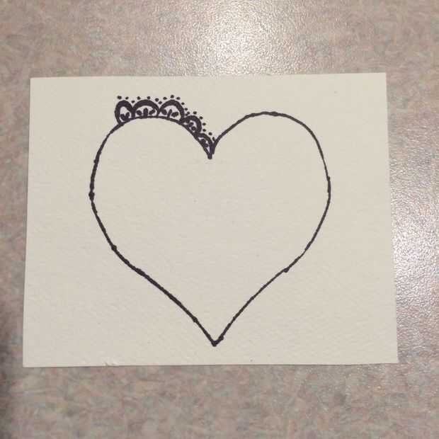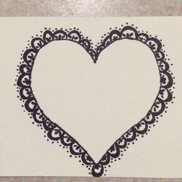 Trace una línea alrededor del corazón con el marcador Sharpie punto fino. Dibujar pequeñas burbujas alrededor del corazón como se muestra continuación línea las burbujas con puntos. Se conviene entonces poco 'pétalos' dentro de las burbujas. Cuando el corazón dibujo terminado aplicar cinta o rodillo adhesivo tiras a la parte posterior del papel de corazón y tarjeta. Tenga en cuenta que este corazón específico no es mi diseño, lo vi en YouTube.