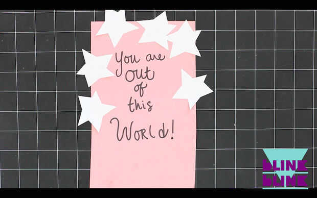 Seguir adelante y decorar la tarjeta. Dejamos espacio en la parte inferior para añadir un OVNI que se enciende cuando se presiona. Hemos hecho esta tarjeta para un amigo que ama interplanetaria satélites, extraterrestres y todas las cosas.