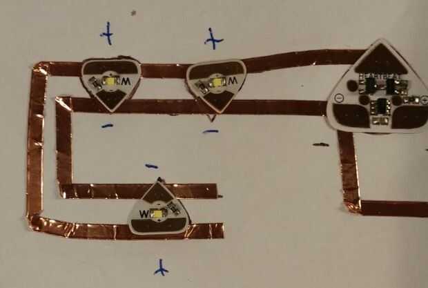 Nos basamos el circuito del latido del corazón en la plantilla de la etiqueta engomada del efecto que ha creado Chibitronics. El espacio entre las líneas donde van las etiquetas engomadas del LED es apenas 1/4" y utilizando la plantilla tiene el espacio adecuado. Las pegatinas de efecto son un poco más complicadas cuando establecen la cinta de cobre, ya que están más separados y tres esquinas.