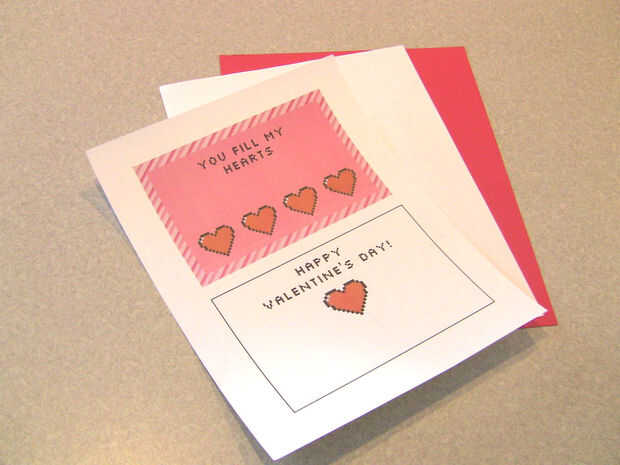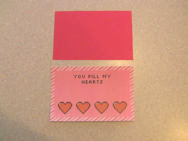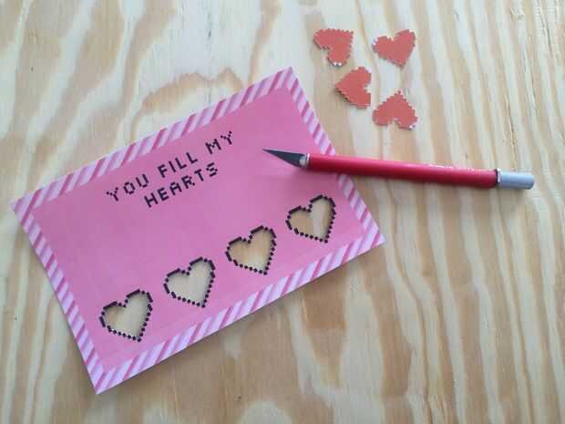 A continuación, necesitará utilizar un cuchillo X-ACTO para cortar cuidadosamente el corazón de píxeles desde la parte delantera de la tarjeta. Asegúrese de quitar la parte roja del corazón; deja el contorno negro.