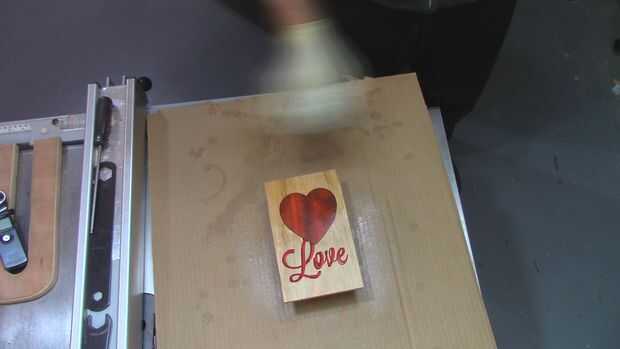 Si usted no toma ningún Consejo de mí alguna vez, por favor tome este. Antes de empezar a spray una capa fina de laca o goma laca de la pintura sobre la pieza. Esto le ahorrará trabajo y tiempo. Después de haber hecho que pueden pintar las letras y ser tan poco como desee. Una vez que la pintura esté seca se puede lijar simplemente la parte superior dejando las letras muy bien acabadas. Repetí estos pasos con el otro lado, pero añadí un pedazo de padauk embutido a la mezcla. Antes de que pegué el corazón en lugar que pintado de negro para ocultar el error que hice con la incrustación del perímetro del corazón. El corazón no encajarán muy bien, soy bueno de alegre no con los bordes pintados dio una gran sombra.