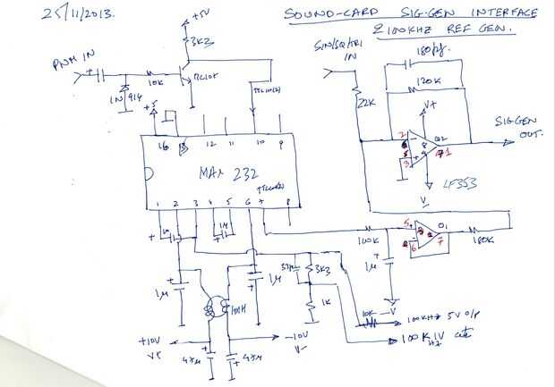 La interfaz de la tarjeta de sonido de PC implementa un generador de señal con pecado/cuadrado/triángulo salida frecuencia variable de 50Hz a 10 kilociclos, una variable de amplitud de 0 a 5V y un desplazamiento de DC de +-4V.