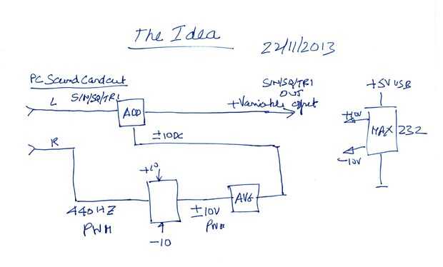 2. un canal de la tarjeta de sonido de PC puede ser programado para una forma de onda PWM de frecuencia fija de salida que cuando convierte en +-10V con el MAX232 y un promedio de proporcionaría un voltaje DC variable dependiendo de la configuración del PWM.