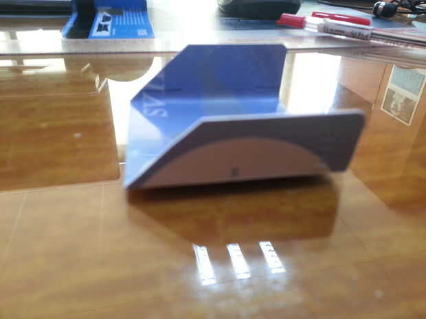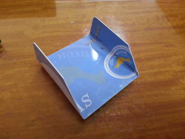 Crear la Asamblea de soporte del teléfono base doblando los bordes opuestos de la tarjeta hasta 90 grados y corte los bordes de la esquina con una tijera como se muestra. Usar un encendedor para hacer flexible y plegable para evitar romper la tarjeta de la tarjeta.