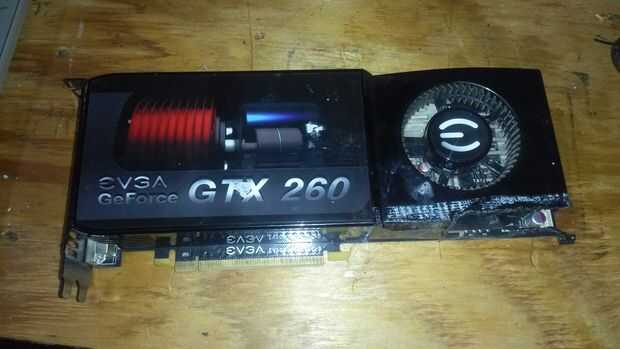 Este es mi fiel Geforce GTX 260. Ha visto mejores días, el recinto ha sido hackeado para arriba para que quepa en una placa base que no debería haber estado nunca en. Normalmente ese agujero tiene cinta de pato Bubba Billy. Pero de todos modos cuando empecé a conducir esta tarjeta dura funcionaba caliente. Me encantó esta tarjeta así que era momento para intentar salvarlo.