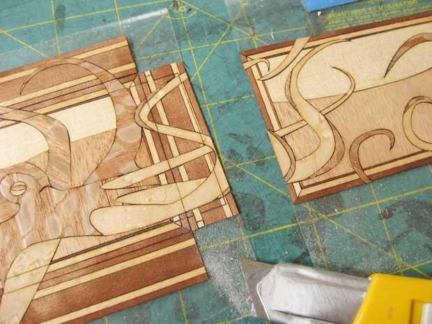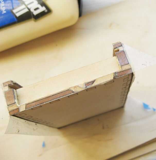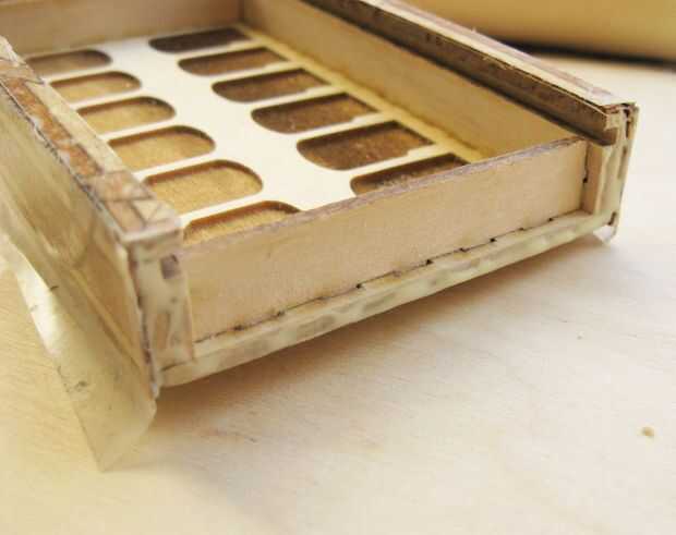 Pegamento de pares de lados en secuencia - ambos lados largos, dos cortas laterales, etc.. Después de cada lado arena abajo cualquier chapa extra se extiende más allá de los bordes de la caja. Trabajando de esta manera mantiene la revela simétrica. Por supuesto, el revela es aproximadamente 1/40 de pulgada, por lo que no es el fin del mundo si no lo haces perfecto, pero después de haber colocado 1/32 de 2/32 piezas de chapa no estoy dispuesta a cortar cualquier esquinas ahora.