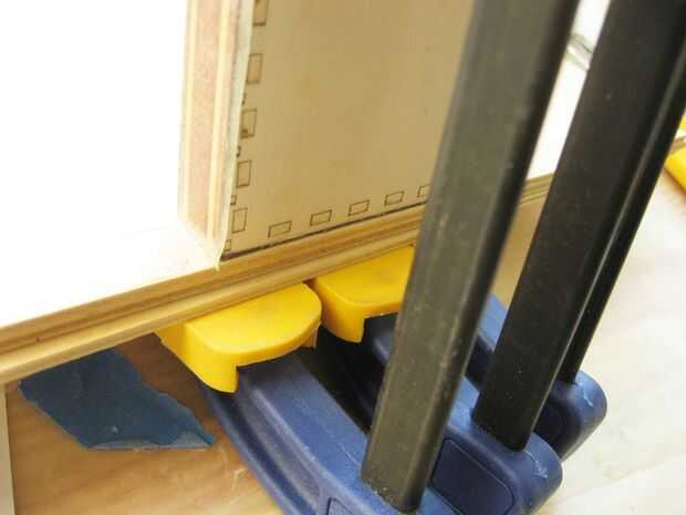 Extender una fina, capa de cola para madera sobre el panel que está pegado. Coloque con cuidado la chapa del panel y luego la abrazadera hasta algo dura y perfectamente plana (yo uso una pareja capas de madera contrachapada) hasta que el pegamento se establezca. Esto evita que los bordes de la chapa que se encrespa cuando absorben la humedad de la cola. Lije los bordes de ese panel y pasemos a la siguiente.