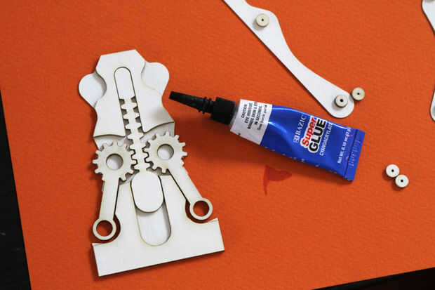 Una vez que todo estaba en orden, comencé a pegar la capa interna de la capa base con pegamento, cuidando de no para pegar accidentalmente abajo cualquiera de las partes en movimiento.