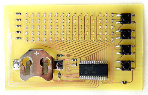De la soldadura de los componentes en la placa, a partir de la primera más pequeña (ver fotos). Un par de pinzas es útil que aquí - poniendo una gota de soldadura en un cojín, y luego volver a fusión de lo mientras coloca las resistencias o condensadores con las pinzas, puedes perfectamente añadir estos pequeños componentes. No importa que forma alrededor de estos componentes van, pero lo hace para el PIC (que debe leer con la escritura la manera correcta para arriba como se muestra en estas fotos), y también hay que poner los LEDs alrededor de la manera correcta. Es más difícil contar con los LEDs que forma alrededor de ellos debe ir - la conexión superior debe ser el positivo (o "ánodo"). Se puede saber consultando la hoja de datos para el LED - uno de los dos conductores generalmente se marcará de alguna manera. Una más fácil manera es a veces probar uno de ellos uniendo un par de cables a un pequeño 1.5V batería y luego tocarse las puntas de los extremos de los LEDs - si es la manera correcta, usted debe ver un resplandor, pero si con un solo 1, 5V batería, va a ser extremadamente débil, por lo que tienes que observar cuidadosamente. Una vez más, un tutorial de soldadura no está dentro del alcance de este artículo - advierto que esto no es proyecto de un principiante, por lo que éste no haga su primer emprendimiento en montaje en superficie de soldadura! Nota que los LEDs se sueldan sólo inicialmente en su plomo de la parte inferior - usamos algunos cables más adelante para conectar su parte superior lleva.
