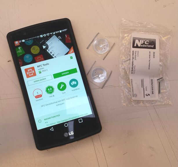 • Algunas etiquetas NFC. Conseguimos nuestro de nfc-nederland.nl, pero usted puede encontrar en Amazon , DealExtreme o así. Asegúrese de comprobar cuánta memoria necesita poner toda su información en uno, puesto que las etiquetas NFC tienen una capacidad muy pequeña (piensas bytes!).