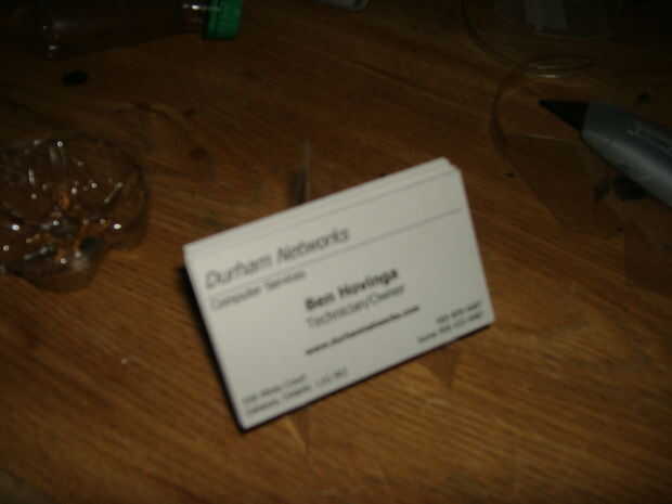 OK, tal vez esta idea de tarjeta de visita no es para todos, pero puede ser para usted. tuve un sello hecho por cerca de $20 y corté 20 tarjetas de una sola caja de cereal y sello de la parte posterior. cada tarjeta tiene un diseño único (a veces un