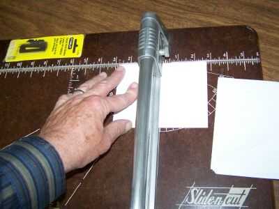 Se trata de un cortador de papel dado a mi esposa y por mis suegros hace muchos años. Aunque no es fácil ver en esta foto, he pintado un punto rojo en la escala de la izquierda en 5 1/2 pulgadas, 4 1/4 pulgadas y 2 3/4 pulgadas. Esto marca para fácil corte en mitades, cuartos y octavos.