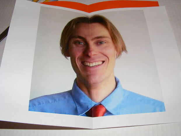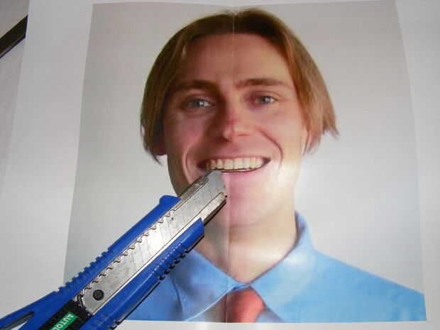 En la parte frontal de la imagen al azar, encuentre la línea central de la cara. Pliegue y pliegue de la imagen a lo largo de la línea central.