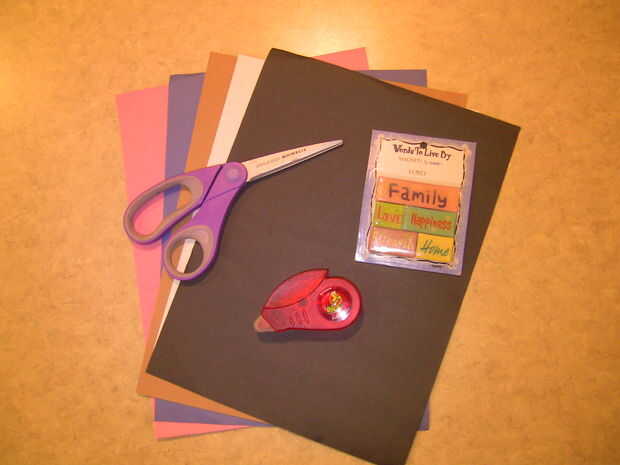 Papel de construcción rosado, púrpura, rojo, azul, naranja, tan, negro y blanco. Cantidad necesaria: rosa: 2, todos los demás colores: 1.