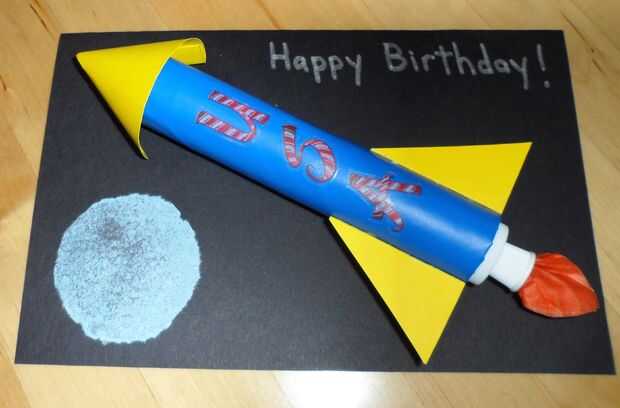 Utilizando un rotulador plata, escribir el mensaje en la tarjeta. Luna de pegamento y cohetes a la tarjeta.