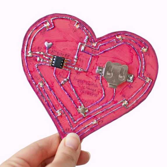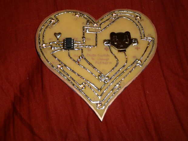 Este año para San Valentín, he hecho una tarjeta PCB en la forma de un corazón (en caso de que no podía decir). Parpadea 12 LED SMD rojo usando charlieplexing con un ATtiny13a, corriendo fuera de una sola batería de botón CR2032.