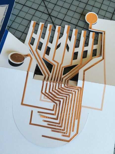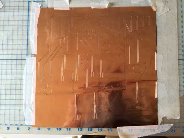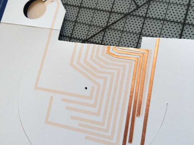 Después de que usted tendrá que ajustar a la atención, porque esto es duro: tienes que levantar cada pieza pegajosa cuidadosamente y colocarlo en la tarjeta impresa. Debe ser muy cuidado de no conseguir enredado, o lo rip y coloque cuidadosamente a lo largo de las líneas. Para piezas largas, cabe transferir cobre a un pedazo de papel de cera, por lo que no pega en alguna parte que no desea adherirse como usted está colocando. Mira muy cuidadosamente antes de colocar cada pieza para asegurarse de que usted está poniendo en el lugar correcto: todas las piezas son diferentes. También dobla primero el papel y envolver el cobre alrededor de la tapa... Si pega el cobre sobre papel de plano, probablemente romperá cuando te retiras la tarjeta y luego el circuito se rompe.