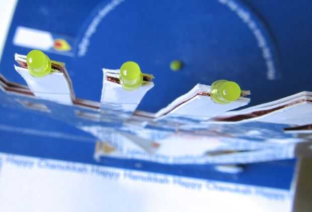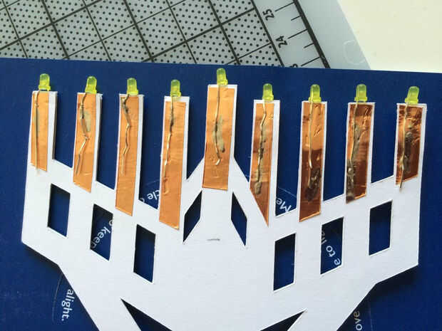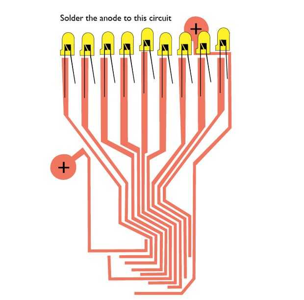 Comenzará por soldar los ánodos LED 9 al lado del circuito de pop-up de la plantilla como se muestra en el dibujo 2. Luego se pega la pieza intermedia, el Menorah simple cut-out sobre el soldado + circuito, doblando el los cátodos frente a la pieza media por lo que no pueden hacer contacto con el + el circuito y se puede soldar a la cinta de cobre en el frente.