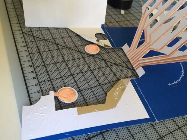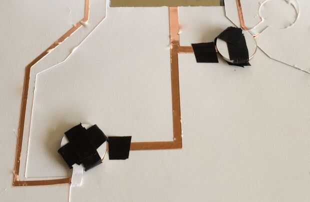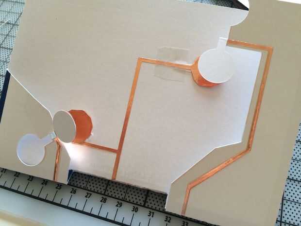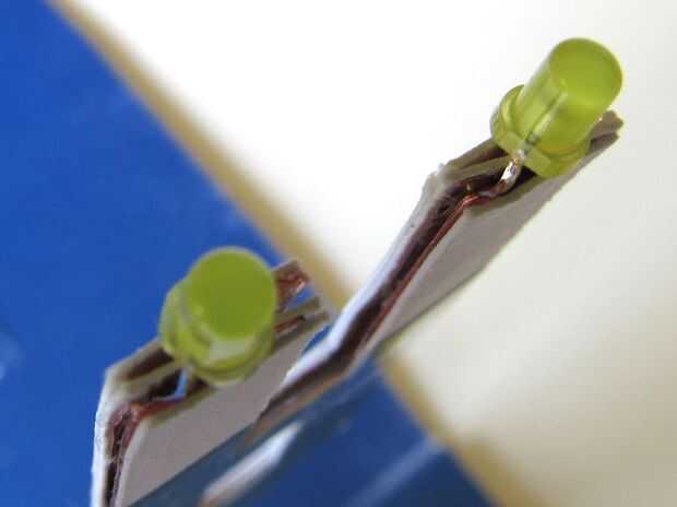 Yo estaba preocupado que suelda quemar mi papel, pero resultó que funciona muy bien, siempre y cuando utilice un alambre muy fino de soldado con flux y trabajar rápidamente con un ligero toque. Calienta los cables LED brevemente con la punta de mi hierro y tocó el alambre de soldado a la punta mientras corría arriba y abajo el plomo (que se presionó contra la cinta de cobre). No adecuado procedimiento de soldadura, sé, pero quería evitar poner demasiado calor en mi papel. La soldadura fluyó perfectamente, fijar sólidamente el plomo para el cinta de cobre, y no quema el papel.